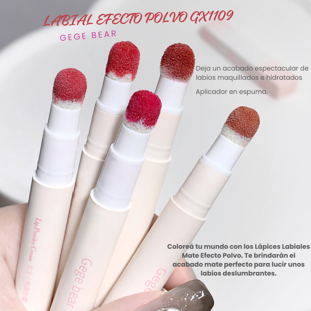 El Lip Effect – Labial Efecto Polvo GX1109 es un labial innovador con aplicador en esponja que deposita pigmento de alta intensidad y deja un acabado mate en polvo, ligero y sofisticado.